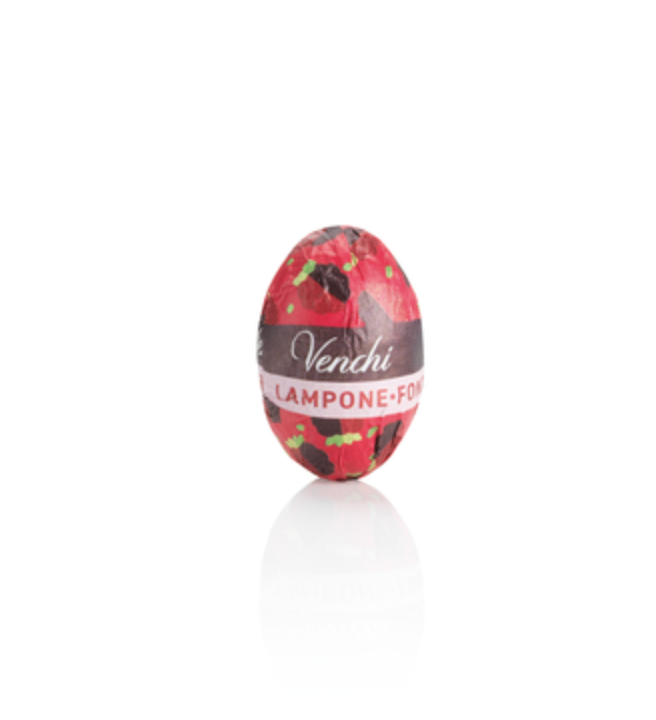 Venchi chokladägg i lösvikt. Mörk choklad med mandel och hallonfyllning samt crunch från frystorkade hallon.